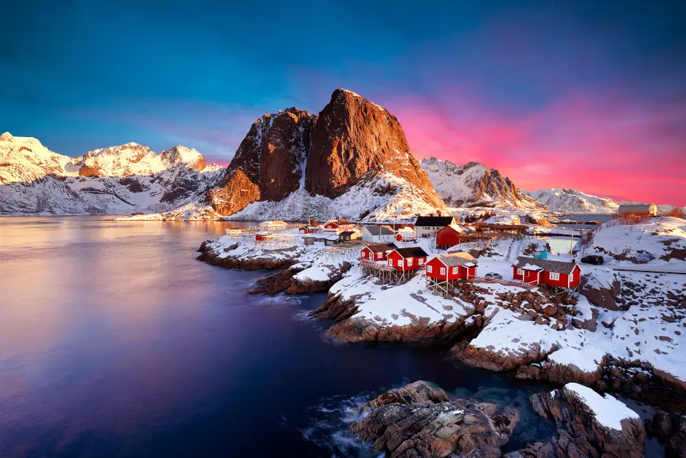 - Reine & Hamnøy – zaskakują krajobrazem jak z pocztówki, na który składają się czerwone rorbuer (tradycyjne domki rybackie) na skałach, mosty na tle pionowych ścian gór i smukły fiord. Rano w miasteczku można zobaczyć kilka łodzi, a także poczuć zapach kawy i suszonej ryby. Wieczorem miękkie, złote światło rozlewa się malowniczo po dachach. To najlepsza baza na rejs po Reinefjorden oraz szybkie wejście na Reinebringen.