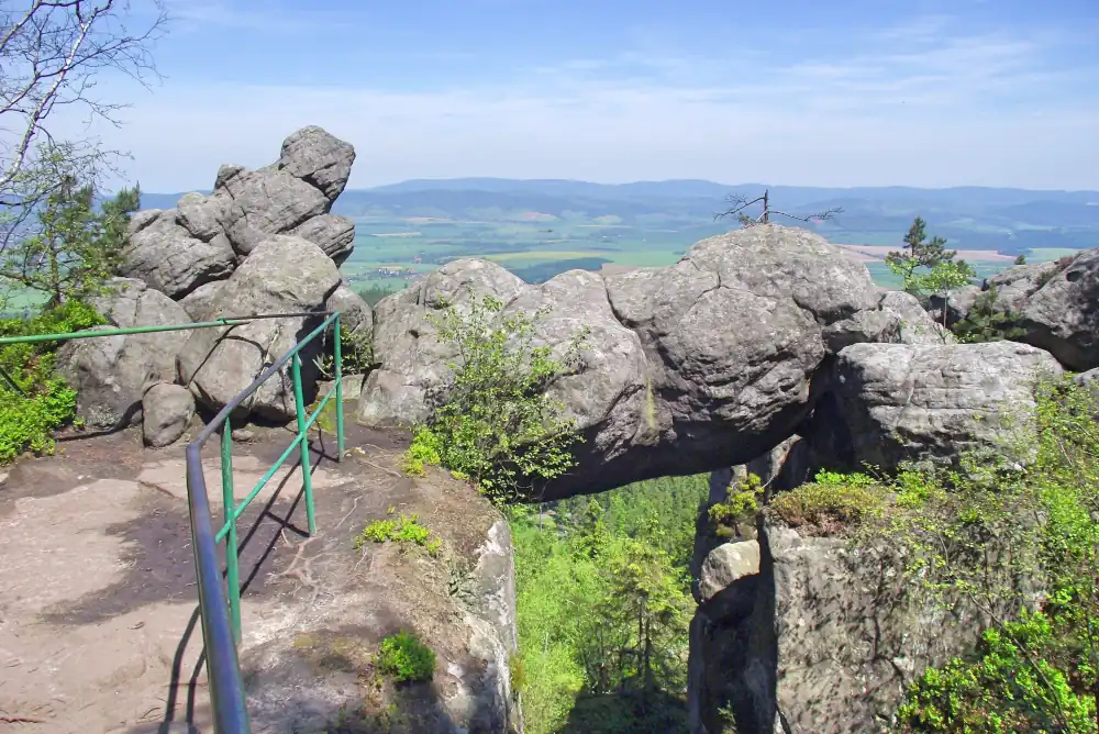 Trasa wiedzie przez urokliwy las, w którym latem czuć przyjemny chłód, a jesienią kolory liści tworzą malownicze tło. Mimo że podejście może zmęczyć, warto zatrzymać się na chwilę i spojrzeć w tył – panorama Kotliny Kłodzkiej i okolicznych wzgórz wynagradza każdy krok. Po około 30 minutach marszu dotrzesz do największej atrakcji, czyli wejścia na teren labiryntu skalnego.